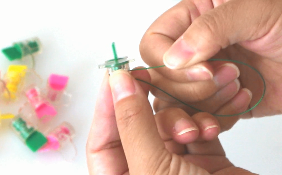2.将旋叶旋转至铅封上面的孔和内芯的圆孔对应上的位置时候,再讲另外一头没有固定的铅封线,由外壳的圆孔,经过内芯的圆孔,穿至另外一侧,拉出。